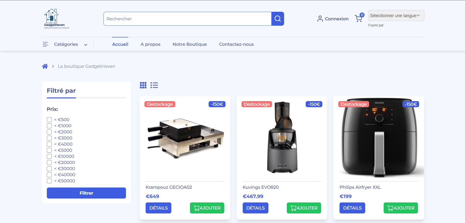 Création d’une boutique en ligne moderne spécialisée dans les appareils électroménagers et gadgets innovants, offrant une expérience utilisateur simple et fluide.